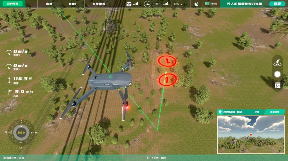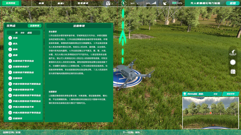 該模塊根據(jù)電力行業(yè)精細(xì)化巡檢標(biāo)準(zhǔn),通過使用無人機(jī)對(duì)高壓電塔進(jìn)行巡檢部位拍攝,以在真機(jī)實(shí)踐前進(jìn)行虛擬仿真培訓(xùn),減少炸機(jī)風(fēng)險(xiǎn),避免飛行時(shí)的安全事故發(fā)生,該模塊具有三種模式,即新手訓(xùn)練、訓(xùn)練模式、考核模式。