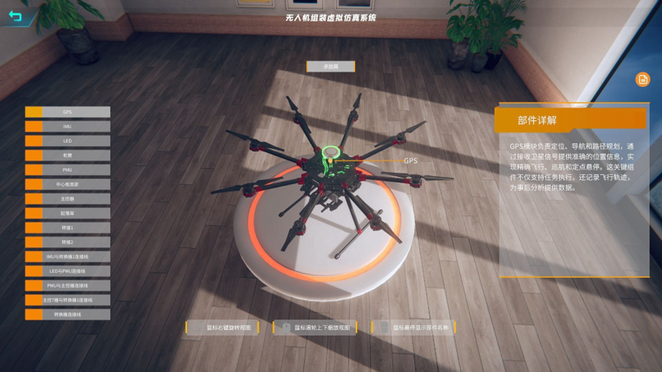 無人機(jī)虛擬仿真系統(tǒng)軟件包含七大應(yīng)用模塊,包含無人機(jī)組裝調(diào)試、無人機(jī)飛行訓(xùn)練、無人機(jī)投擲、無人機(jī)穿越障礙、無人機(jī)電力巡檢、無人機(jī)滅火、無人機(jī)水域救援。