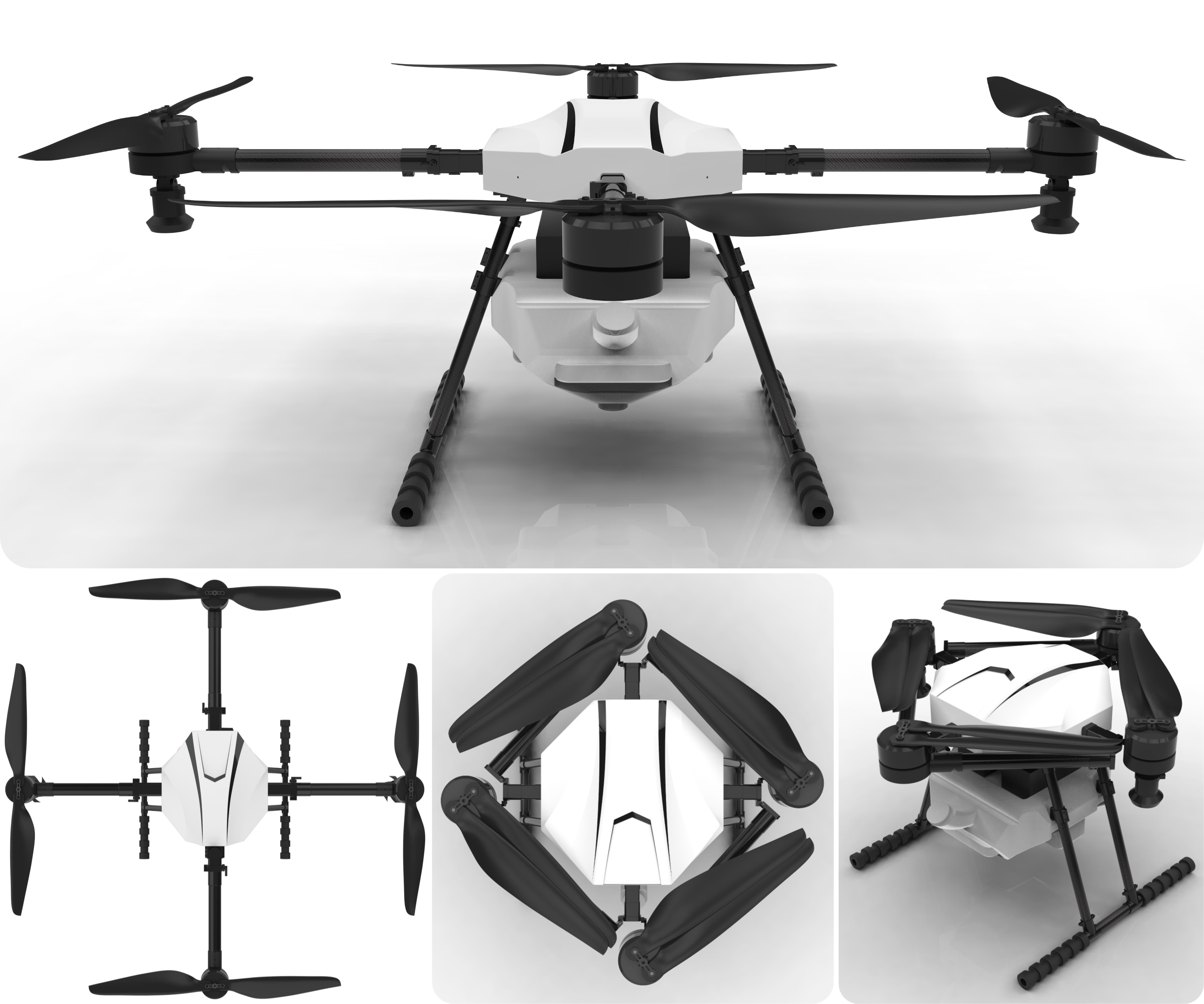 1、機(jī)架:機(jī)身采用四旋翼X型碳纖維結(jié)構(gòu),對角軸距1000mm,機(jī)身尺寸800mm*800mm*600mm,機(jī)臂采用可折疊設(shè)計,上下板采用碳纖維設(shè)計;